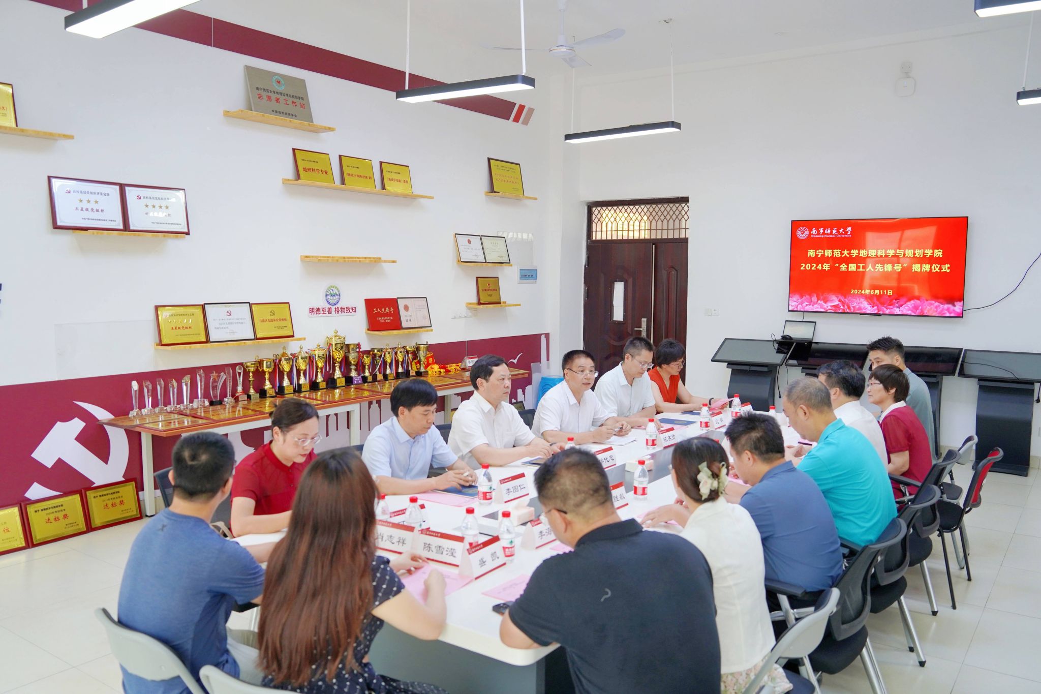 6月11日,学校在武鸣校区地源楼为地理科学与规划学院荣获的2024年“全国工人先锋号”举行揭牌仪式。学校党委副书记、工会主席侯代忠,校工会、组织部、宣传部等部门负责人,地理科学与规划学院领导班子成员及教师代表,地理与海洋研究院和环境与生命科学学院代表参加活动。