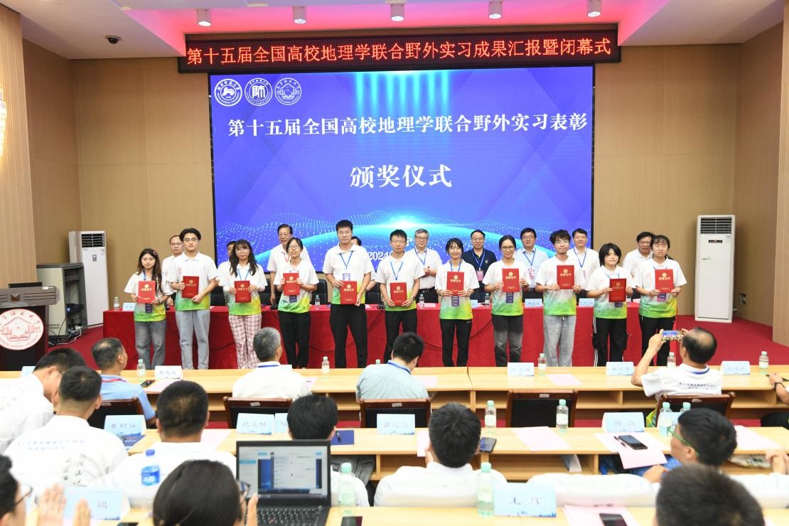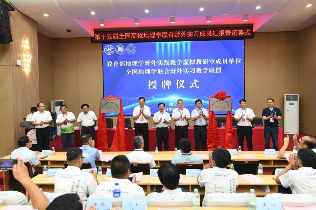 会议第二段为闭幕式,由beats365地理与海洋研究院党委书记黄胜敏主持。本次联合实习的承办方,湖南师范大学地理科学学院院长周国华、贵州师范大学地理与环境科学学院院长周忠发、beats365地理科学与规划学院院长卢远先后总结了湖南、贵州、广西各段的成果、收获与喜悦,大家一致认为,本次联合野外实习200多名师生,冒着酷暑炎热,横跨湘黔桂近2500公里,历经山江海边,之所以能够圆满顺利完成,得益于全国高校地理学联合野外实习联盟的精心指导,得益于3个高校的精心组织和通力协作,得益于参与实习的各高校师生紧密团结、克服困难、坚持不懈的精神和意志。这次联合实习内容丰富,包括城市格局与演变、传统历史和红色文化、喀斯特特征与治理、乡村振兴与旅游产业、山江湖海关系与人地系统以及重要产业群等,不同区域,不同特色,彰显了地理学的广度与深度。中国地理学会副理事长兼秘书长张国友研究员、全国高校地理学联合野外实习联盟理事长郑祥民教授对本次联合实习活动进行点评。他们对承办单位展现出的高度责任心、敬业精神表示充分的肯定,从线路安排、现场协调、服务保障等都体现出了认真负责和高效的工作态度;对随队指导老师的责任担当与专业引领和同学们求知若渴与坚韧不拔的精神风貌予以赞赏。同时,鼓励同学们要有家国情怀,为地理学的繁荣与进步注入鲜活的生命力,为国家发展贡献地理学独特的智慧与力量。会议还表彰了2024年第十五届全国高校地理学联合野外实习卓越实习生、优秀实习生、优秀指导教师。会议举行了授予beats365官方唯一教育部地理学野外实践教学虚拟教研室成员单位、“全国地理学联合野外实习教学联盟”揭牌仪式。