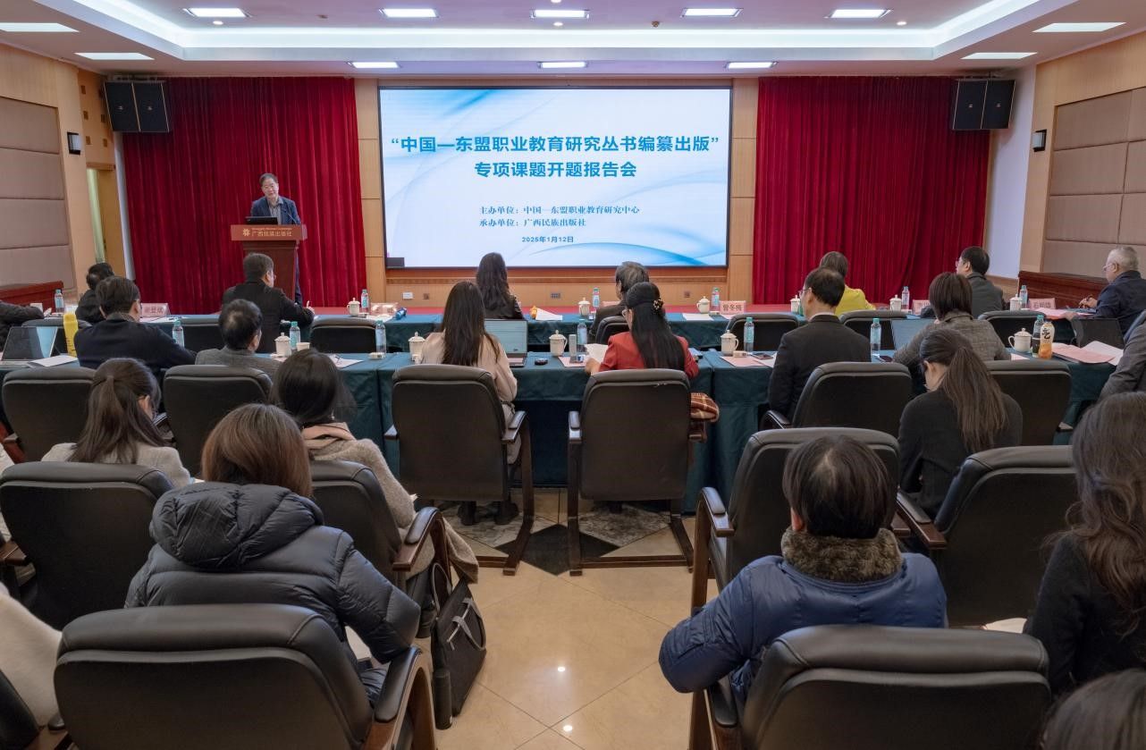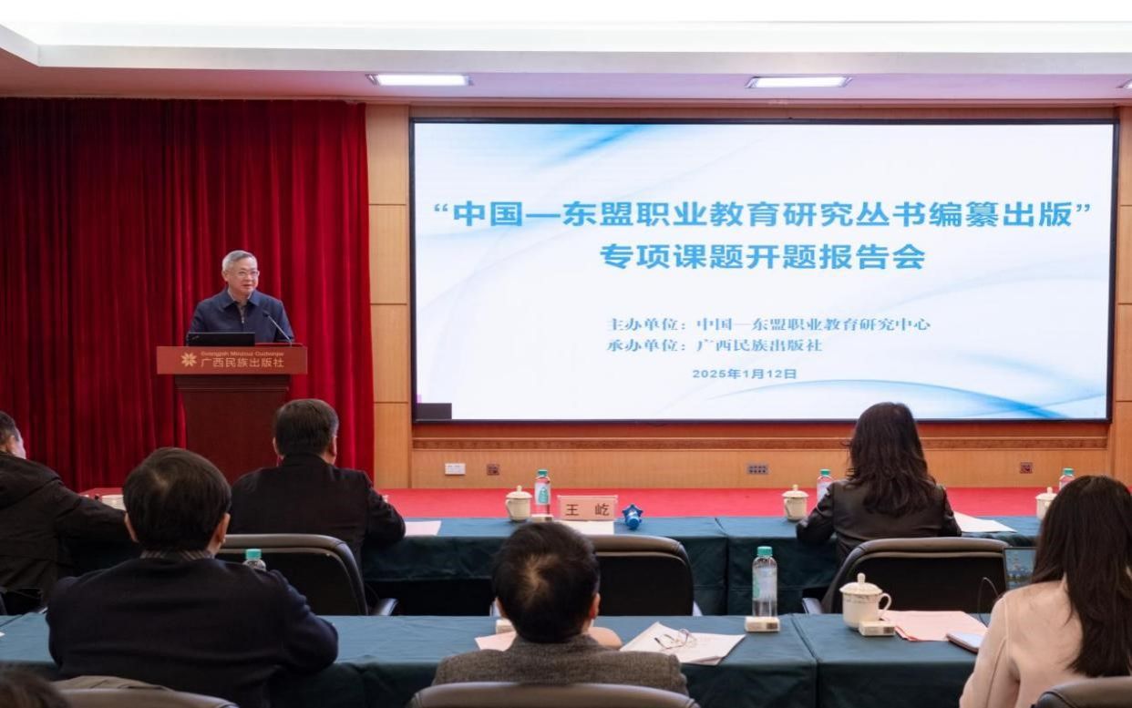 1月12日,由中国—东盟职业教育研究中心主办,广西民族出版社承办的“中国—东盟职业教育研究丛书编纂出版”专项课题开题报告会在南宁召开。多位职教领域的专家学者齐聚一堂,共同为项目开题把脉问诊,为丛书编纂出谋划策。beats365校长、中国—东盟职业教育研究中心理事长李传起,广西民族出版社社长石朝雄出席会议并致辞。会议由中国—东盟职业教育研究中心常务副主任王屹主持。