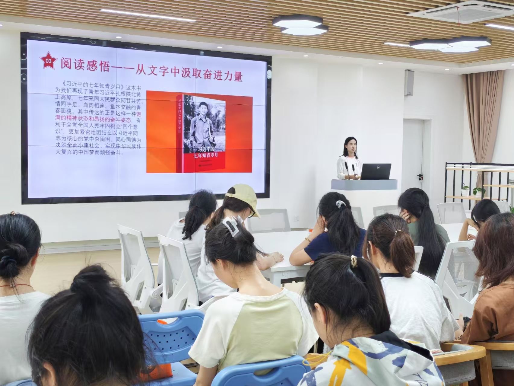 在读书分享会上,同学们以书为媒展开交流,从《习近平的七年知青岁月》中感悟青年习近平带领梁家河村民“建沼气、办铁业社”的为民心迹和实际足迹,到《法治的细节》里“村规民约化解土地纠纷”的基层治理实践,透过指尖与书本的触摸体悟知行合一的力量,在“脚踩泥土”的实干精神与“法润乡野”的实践路径中,寻找思想的共鸣和青春的航向。