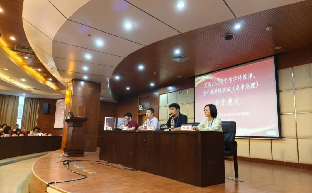 在开班仪式上,地理科学与规划学院副院长罗国玮对参训教师表示欢迎,他介绍了学校的发展历程、学科建设等基本情况,以及地理学科作为优势特色学科的专业设置、学位授权点和科研平台等情况,就本次培训的目标作了说明,希望学员们通过培训提高高中地理学科育德和教学实施能力,培养区域教育教学带头人。该学院刘立昌副教授介绍了本次项目的筹备情况、班级情况、班委组成、班委的工作任务及课程安排等,强调了培训过程中的注意事项,鼓励学员们积极交流,促进教师专业成长,希望学员们能在本次培训班中学习顺利、收获满满,为广西高中地理教育发展贡献力量。