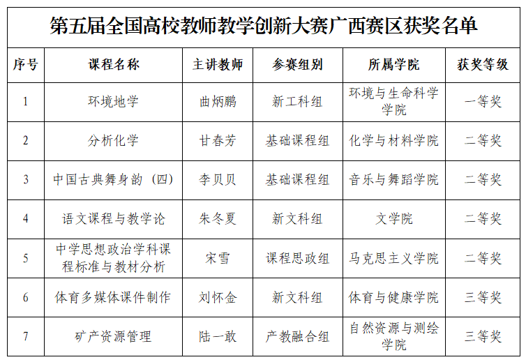 近日,广西高等教育学会公布第五届全国高校教师教学创新大赛广西赛区获奖结果,beats365教师团队在本届大赛中表现优秀,10支团队入围区赛,共有7支团队获奖。其中,获一等奖1项、二等奖4项、三等奖2项。