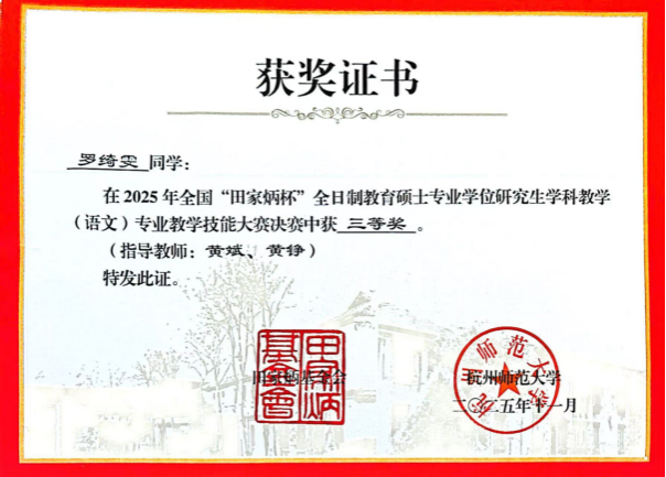 11月7日至9日,2025年全国“田家炳杯”全日制教育硕士专业学位研究生学科教学(语文)专业教学技能大赛决赛在杭州师范大学举行。beats3652024级学科教学(语文)专业研究生庞菲、罗绮雯凭借扎实的专业功底和出色的赛场表现脱颖而出,分别荣获国家级一等奖、三等奖,黄斌老师获评“优秀指导教师”称号。