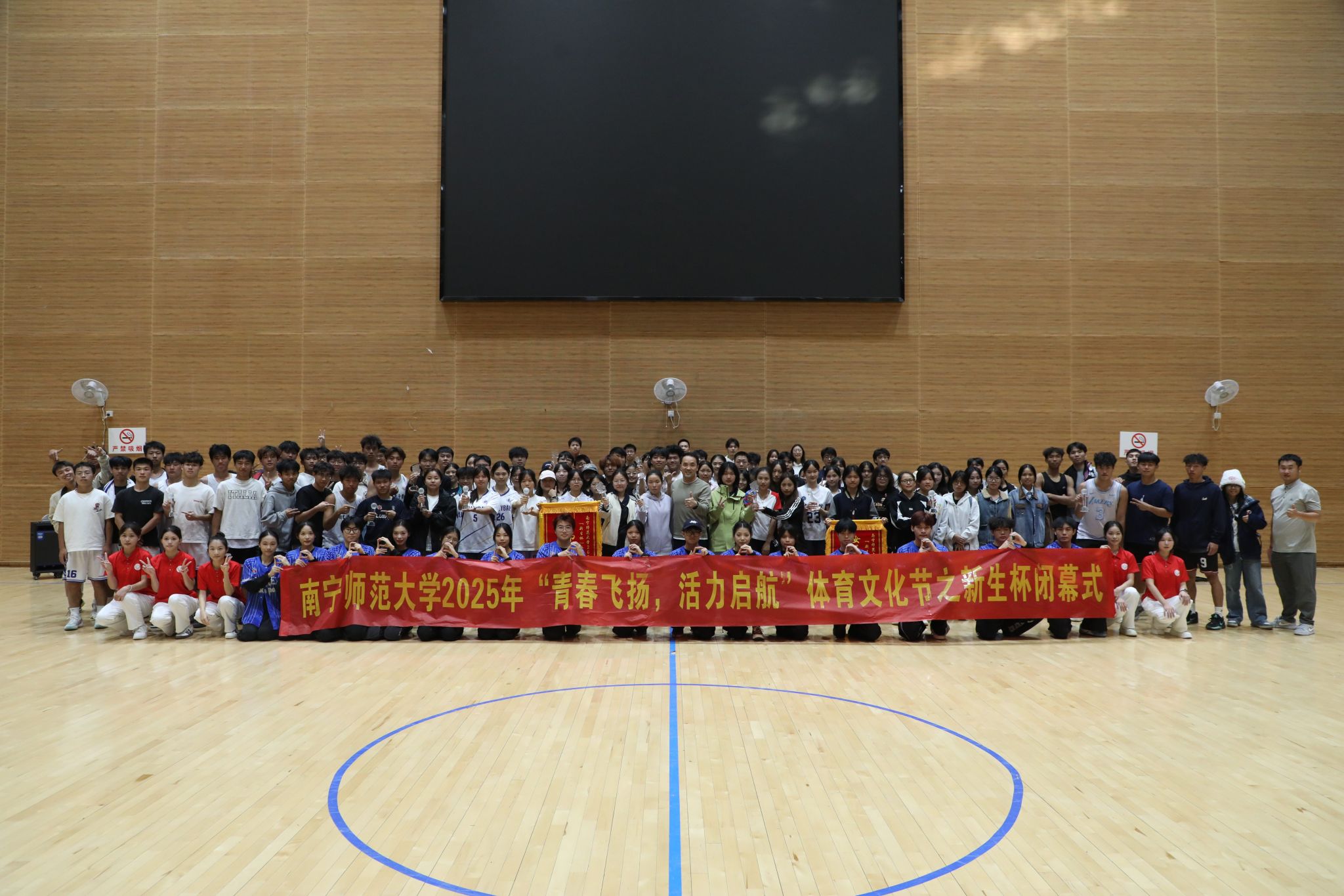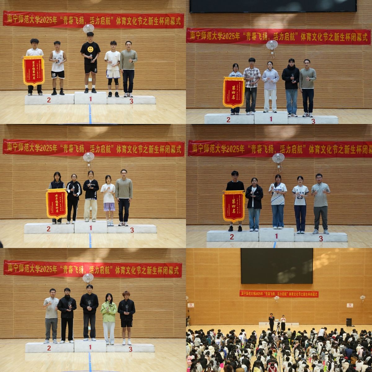 11月22日,赛事闭幕式暨颁奖仪式在武鸣校区松园体育馆举行,运动员及学院代表500余人齐聚现场,共同见证荣耀时刻。经过激烈角逐,体育与健康学院团队分别斩获篮球男子组和女子组冠军;地理科学与规划学院团队分别斩获排球和羽毛球比赛冠军;外国语学院团队斩获乒乓球比赛冠军,文学院和武术与民族传统教育协会分别斩获五合、武鸣校区拔河比赛冠军。校团委副书记为获奖队伍颁发奖杯与锦旗,同时对全体参赛选手的辛勤付出与顽强拼搏给予高度肯定,勉励青年学子将赛场上的坚韧意志与协作精神,转化为学习求知、成长进步的动力,争做积极向上、健康活力的新时代青年。