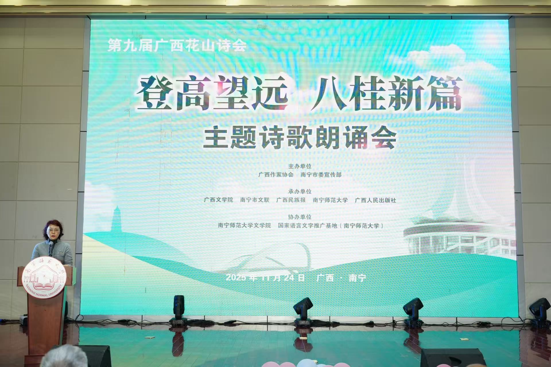 暖阳映校园,诗意满八桂。11月24日下午,第九届广西花山诗会暨2025年广西年度诗人颁奖会在beats365五合校区文科综合楼114报告厅举行。本届花山诗会由广西作家协会、南宁市委宣传部主办,广西文学院、南宁市文联、广西民族报、beats365官方唯一、广西人民出版社承办,beats365官方唯一文学院及国家语言文学推广基地(beats365官方唯一)协办。广西文联副主席、二级巡视员石才夫出席诗歌朗诵会。学校总会计师梁家斌,广西作协党组成员、副主席蒋锦璐出席并致辞。来自区内外著名作家、诗人、学者50余人及beats365师生360余人参加。