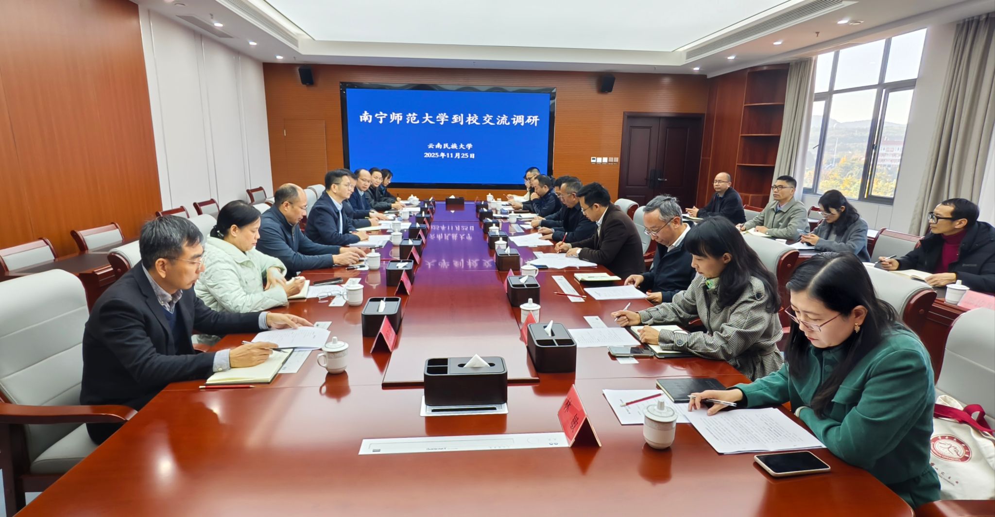 为深化校际合作,学习借鉴兄弟高校的先进办学理念和改革经验,进一步明晰beats365高质量发展路径,11月24日至25日,beats365校长隆广庆、副校长卢远带领发展规划与学科建设处、教务处、科研处、国内合作处、文学院、人工智能学院等部门及学院主要负责人组成调研组,先后赴云南师范大学和云南民族大学开展调研交流。