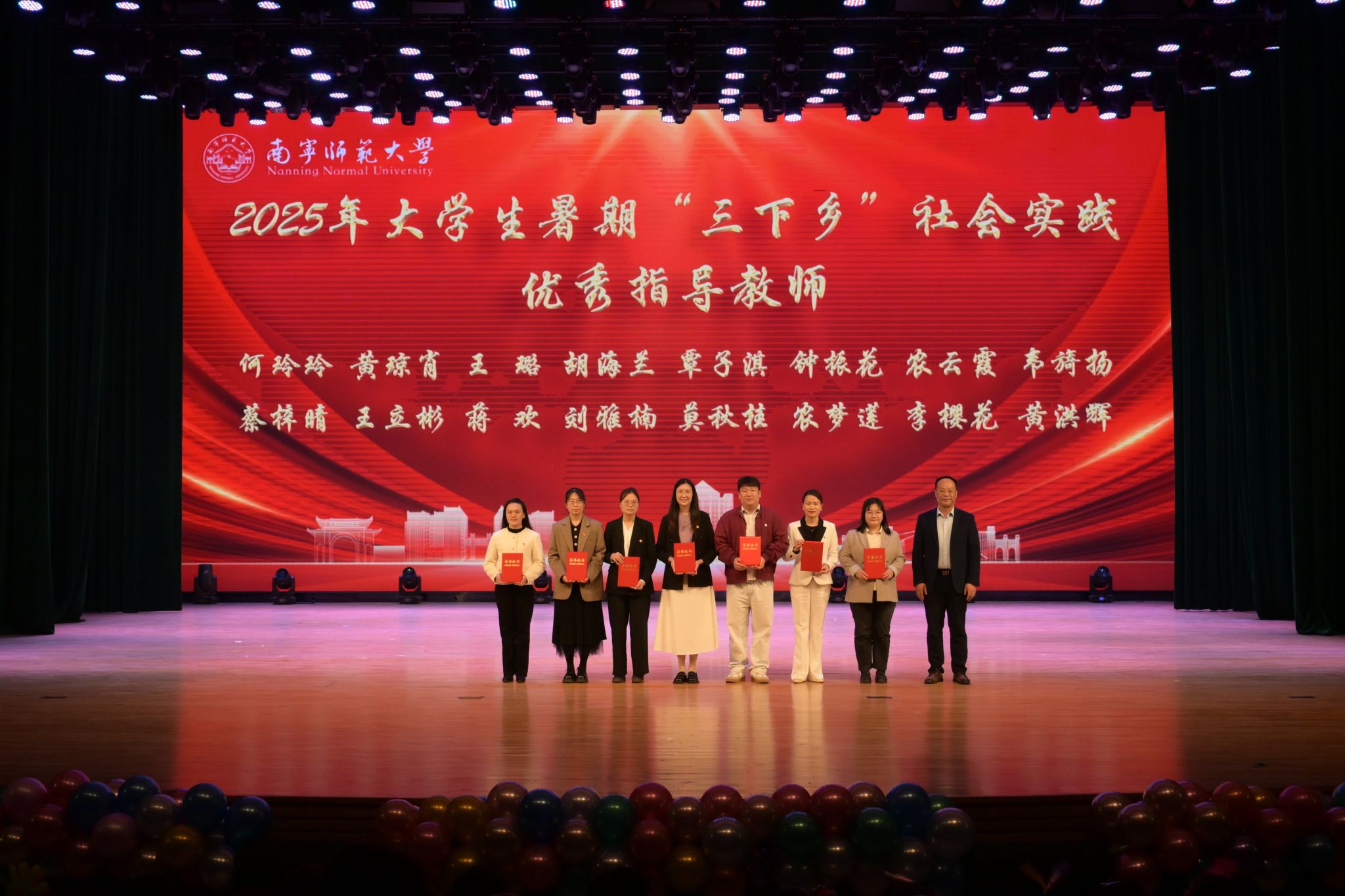 随后,表彰学校2025年暑期“三下乡”社会实践活动优秀团队、先进个人、优秀指导教师以及全国、全区专项团队,颁发全国、全区“挑战杯”大学生课外学术科技作品竞赛荣誉奖项,校领导及相关部门负责人为获奖代表颁发了荣誉牌匾和证书。体育与健康学院团委书记农梦莲、物理与电子学院巫素莲同学作为师生代表发言,分别分享了实践的育人感悟与投身科创的探索历程,传递青春奋斗力量。