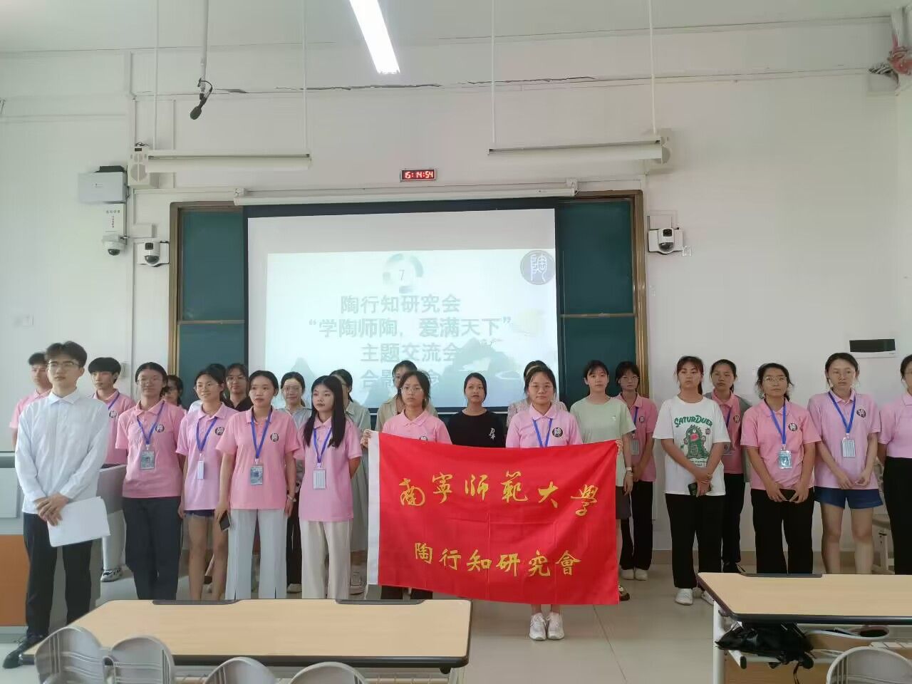 活动开始,主持人介绍了出席本次活动的嘉宾,宣读了活动流程。接着,播放了纪录片《先生》节选片段,该纪录片以展现日常生活的方式将陶行知先生的性格性情、命运经历、对教育的贡献等呈现出来,带领观众走近陶行知先生、走近那个时代。紧接着,主持人讲解了“书香沁南师,经典伴我行”的打卡内容。这个过程充分说明了beats365学子对陶行知先生思想学习的认真与重视,也展示了beats365浓厚的读书氛围。再接着,主持人邀请了现场观众进行了书中故事的分享。其中有一位参与者分享了盖茨比和黛西的爱情故事,阅读《陶行知文集》的独特感受等内容。随后,主持人分享了两个关于陶行知先生的教育思想故事。本次活动过程中穿插了知识抢答互动环节,观众们踊跃参与,现场响起一阵阵雷鸣般的掌声。最后,现场的嘉宾、参与者和工作人员们进行了合影留念。