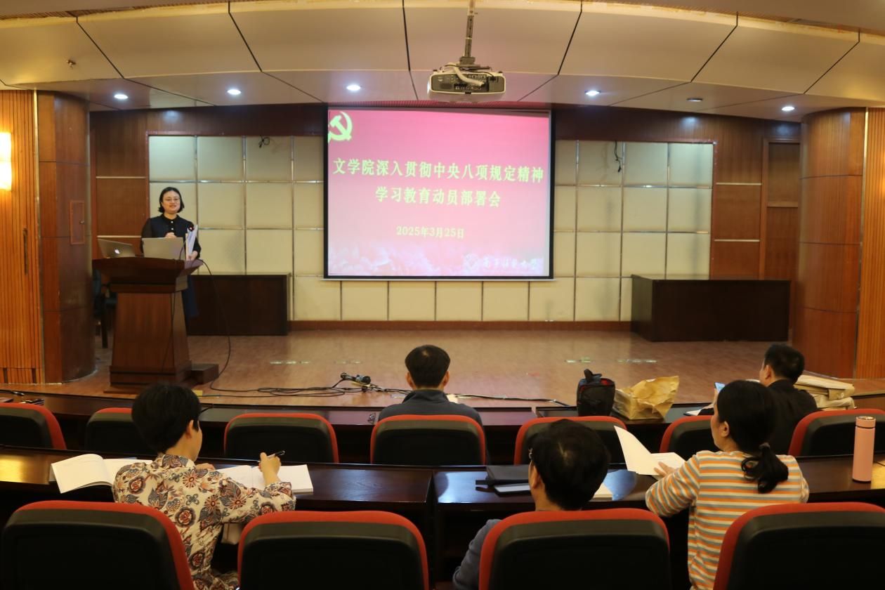 3月25日下午,文学院在明秀校区召开深入贯彻中央八项规定精神学习教育动员部署会。文学院党委书记旷晓霞主持会议并作具体部署,学院领导班子、党委委员及教职工代表参加会议。