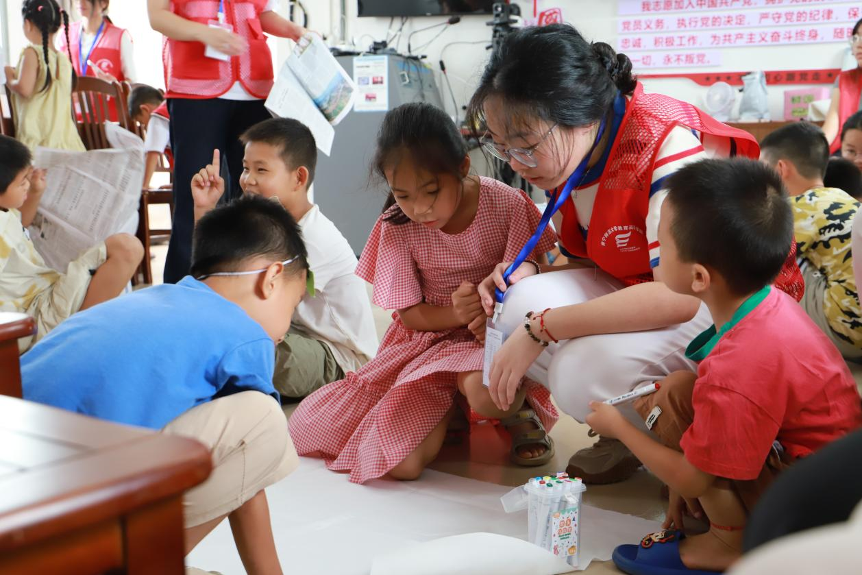 实践团在暑期夏令营中开设非遗扎染、石头绘画、心理健康教育等多元课程,服务天宝村周边学生30余人。在非遗扎染课上,孩子们第一次用靛蓝墨水点染出斑斓图案,体验扎染的乐趣。在石头绘画课上,路边的鹅卵石被孩子们绘成“粽子”“海底世界”等图案,用画笔展示他们的想象力。