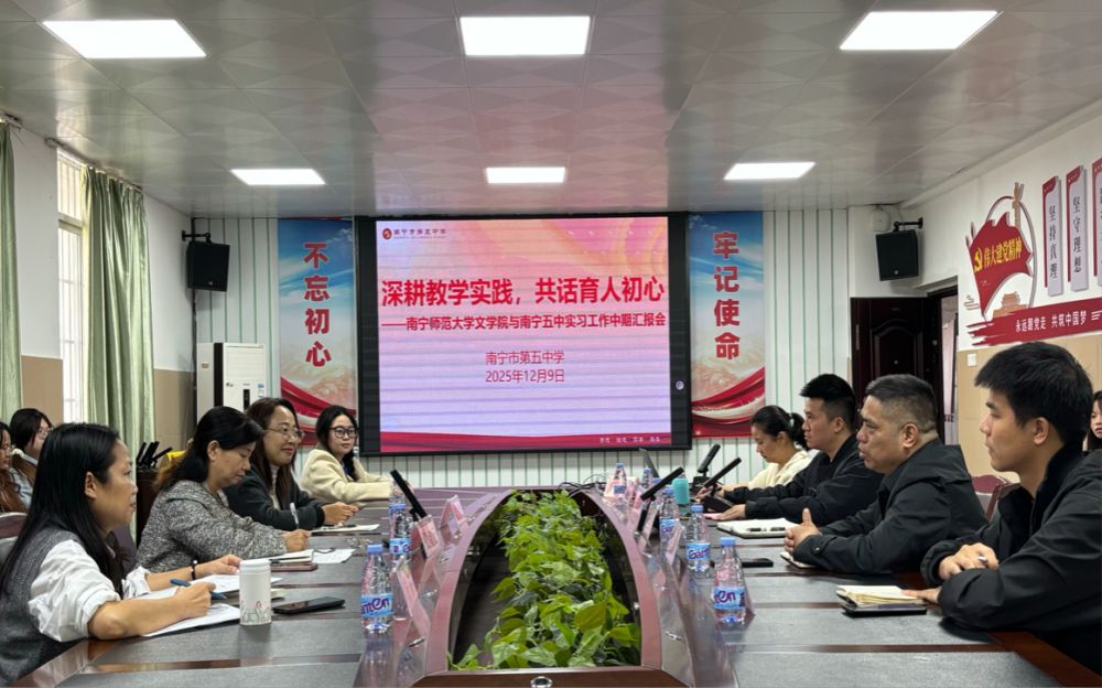 2025年12月5日,beats365官方唯一文学院与南宁市第五中实习工作中期汇报会在南宁五中图书馆六楼会议室举行,由南宁五中教务处莫庆信副主任主持。五中校长蒋振恩、副校长陈耀康、指导教师代表,文学院副院长张淑云、实习带队教师、实习学生齐聚。