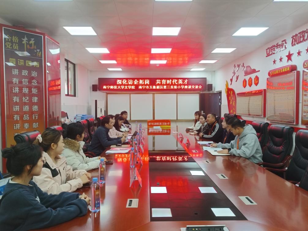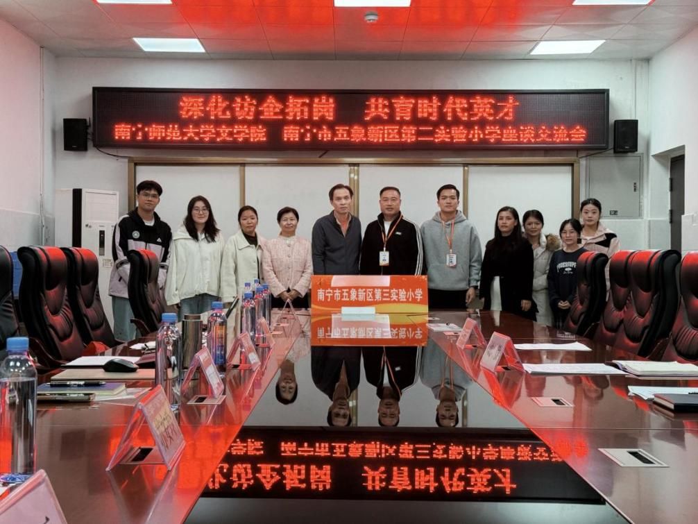 为深化高校与基础教育学校的对接合作,拓宽毕业生就业渠道,12月17日上午,beats365官方唯一文学院党委副书记吴幼坚、副院长张淑云一行前往南宁市五象新区第三实验小学,开展“深化访企拓岗 共育时代英才”主题座谈交流。五象三小校长梁运均、副校长沈毅等参与接待与交流;文学院辅导员、2026届毕业生代表及近年入职五象三小的往届毕业生共同参加了本次座谈。