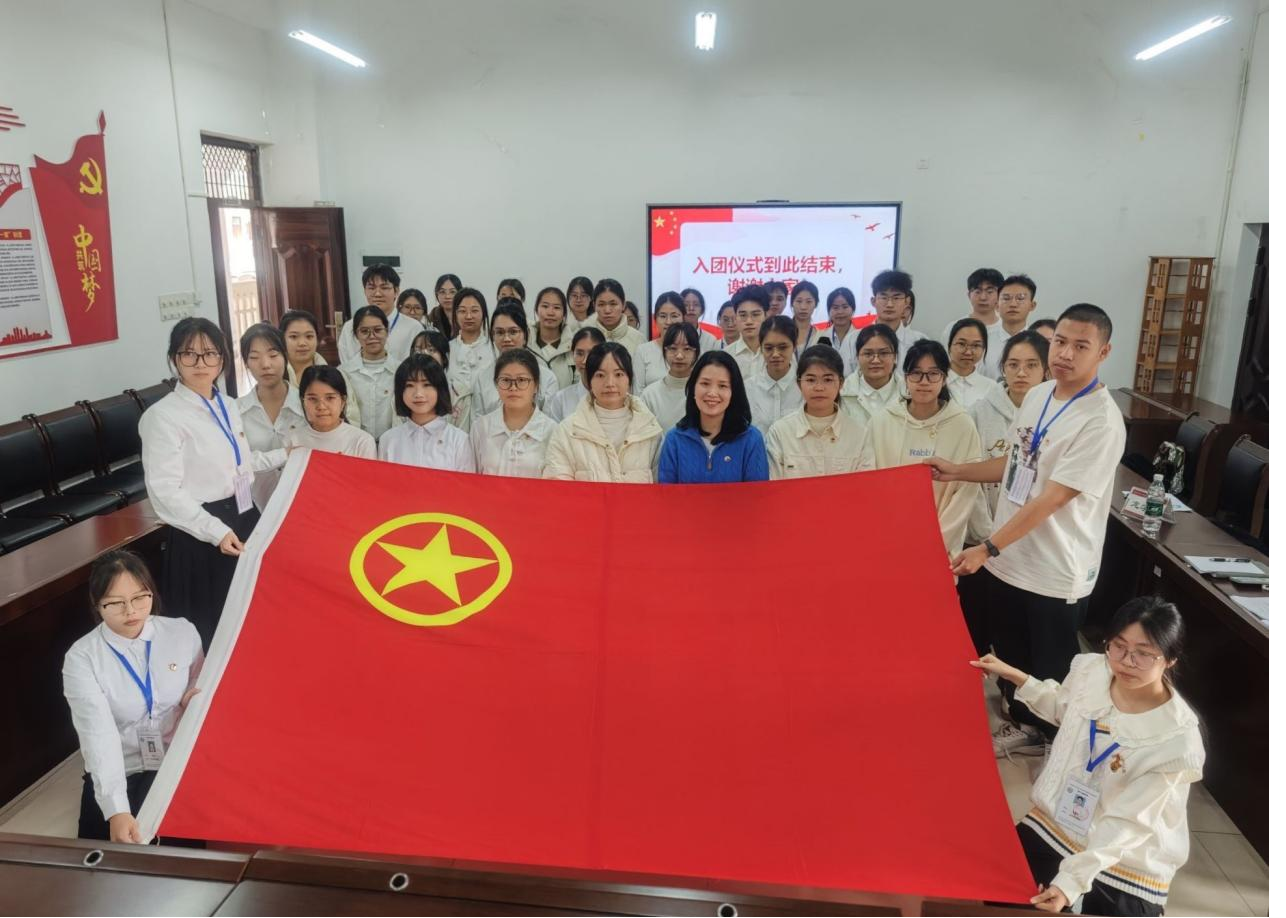 仪式中,龙学禧在致辞中表达了对新团员的祝贺与期望,并勉励他们坚定理想信念,勇担时代责任。龙学禧与辅导员覃辰柳为新团员们逐一佩戴团徽、颁发团员证。新、老团员代表先后发言,新团员代表铿锵表达了矢志奋斗的理想信念,老团员代表庄重传递了传承使命的坚定决心。随后,在工作人员李一鸣带领下,全体新团员面向团旗,举起右拳,进行了庄严宣誓。仪式在嘹亮的团歌声中推向高潮,并在全体人员与团旗的合影中圆满落幕,整个过程规范有序。
