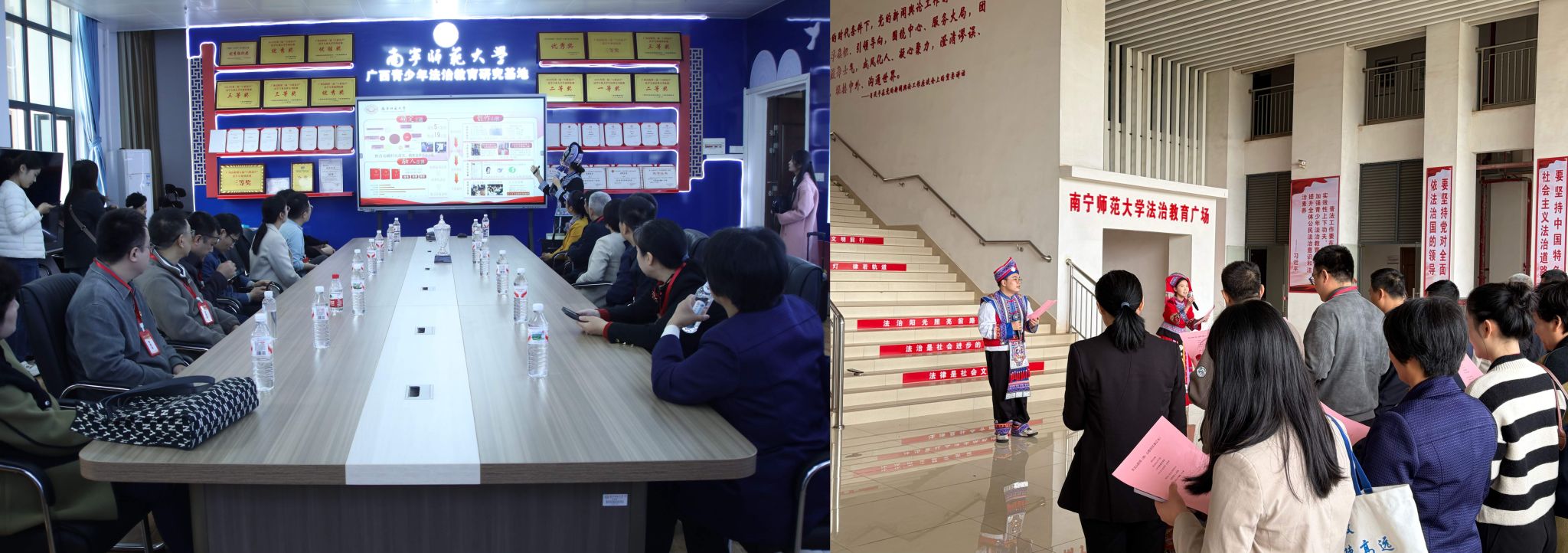 随后,广西开放大学(广西信息职业技术学院)交流团分组实地参观了beats365经济与管理学院党建文化走廊、初等教育学院明德史馆、生命之美标本馆、非遗工作室和广西青少年法治教育基地,并在基地前合影留念。