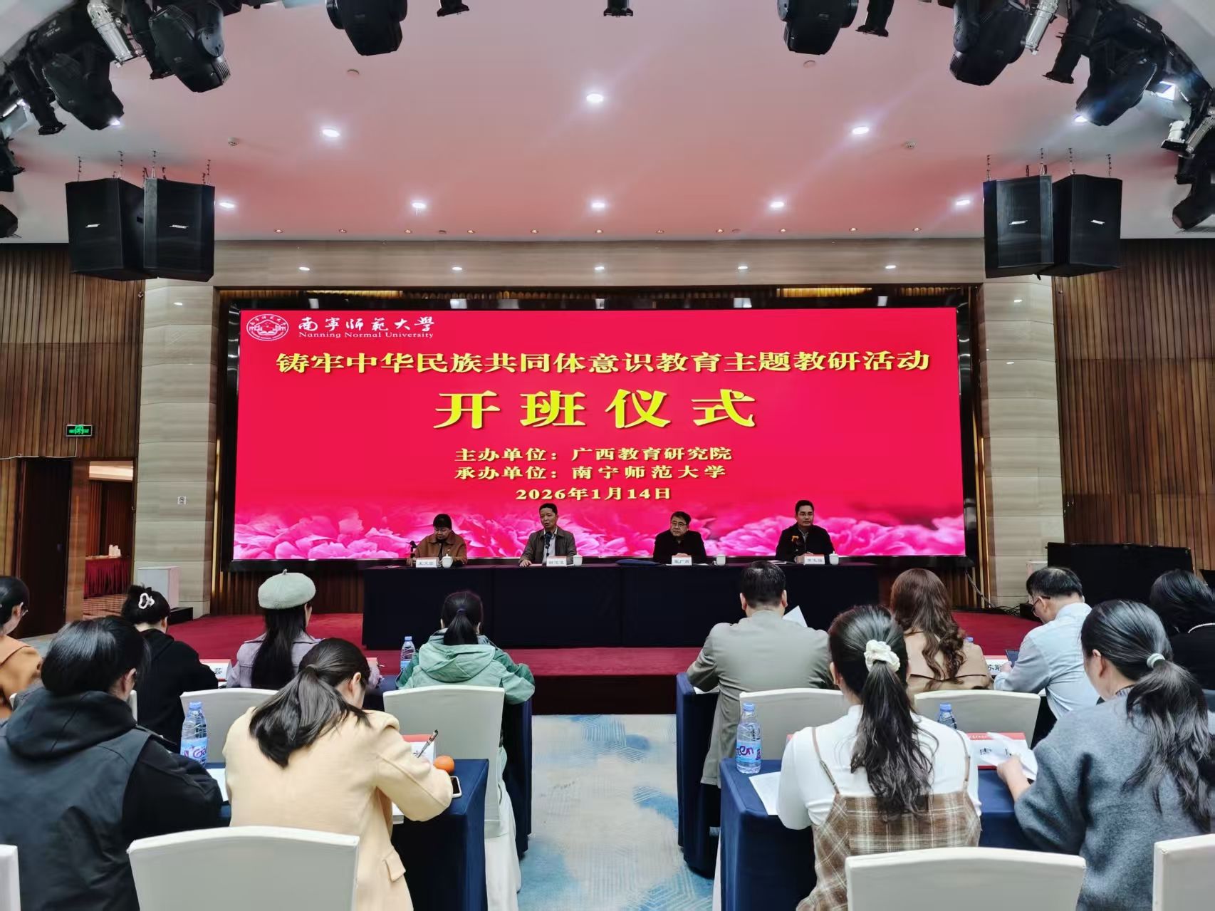 1月14日上午,由广西教育研究院主办,beats365官方唯一承办的“铸牢中华民族共同体意识教育主题教研活动”在南宁顺利开班。活动旨在打造专业化教研队伍,将铸牢中华民族共同体意识深度融入教育教学全过程。广西教育研究院谢凌凌院长,新疆文史研究馆戢广南研究员,beats365官方唯一教师教育学院王文蓉院长,广西教育研究院黄玉强副院长和来自全区14个地市教科所领导及教研员共88人参加了本次活动。
