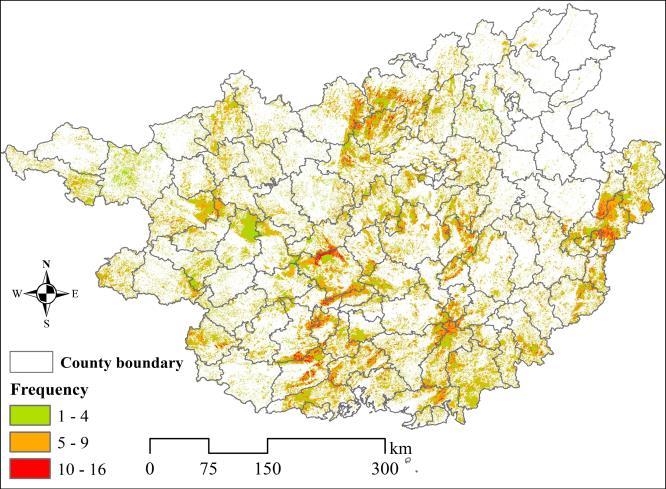 图1自2004年至2019年期间,遥感图像中被自动识别并归类为桉树的像素点频数分布
