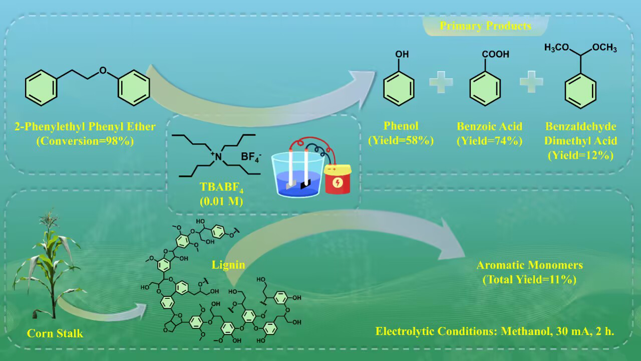 利用电化学方法解聚木质素制备低分子量芳香族化合物,具有条件温和、碳排放低的优势,但现有非金属催化体系在选择性和催化活性方面仍存在较大挑战。本研究发现,高熔点有机盐类四丁基四氟硼酸铵在室温和空气气氛中可以同时作为催化剂和氧化剂,从而高效催化木质素中C-O键的裂解。以玉米秸秆木质素为例,其转化率可达86.95%,芳香族化合物的总收率为11.2%。机理研究表明,在合适的电解条件下,四丁基四氟硼酸铵生成的TBA+阳离子自由基对木质素底物的活化起到关键作用,超氧阴离子也在解聚过程中起了重要作用。此外,四丁基四氟硼酸铵作为电解质还提高了反应体系的导电性。本研究为木质素的高效电化学解聚提供了非金属催化新路径,具有重要的科学意义和应用潜力。