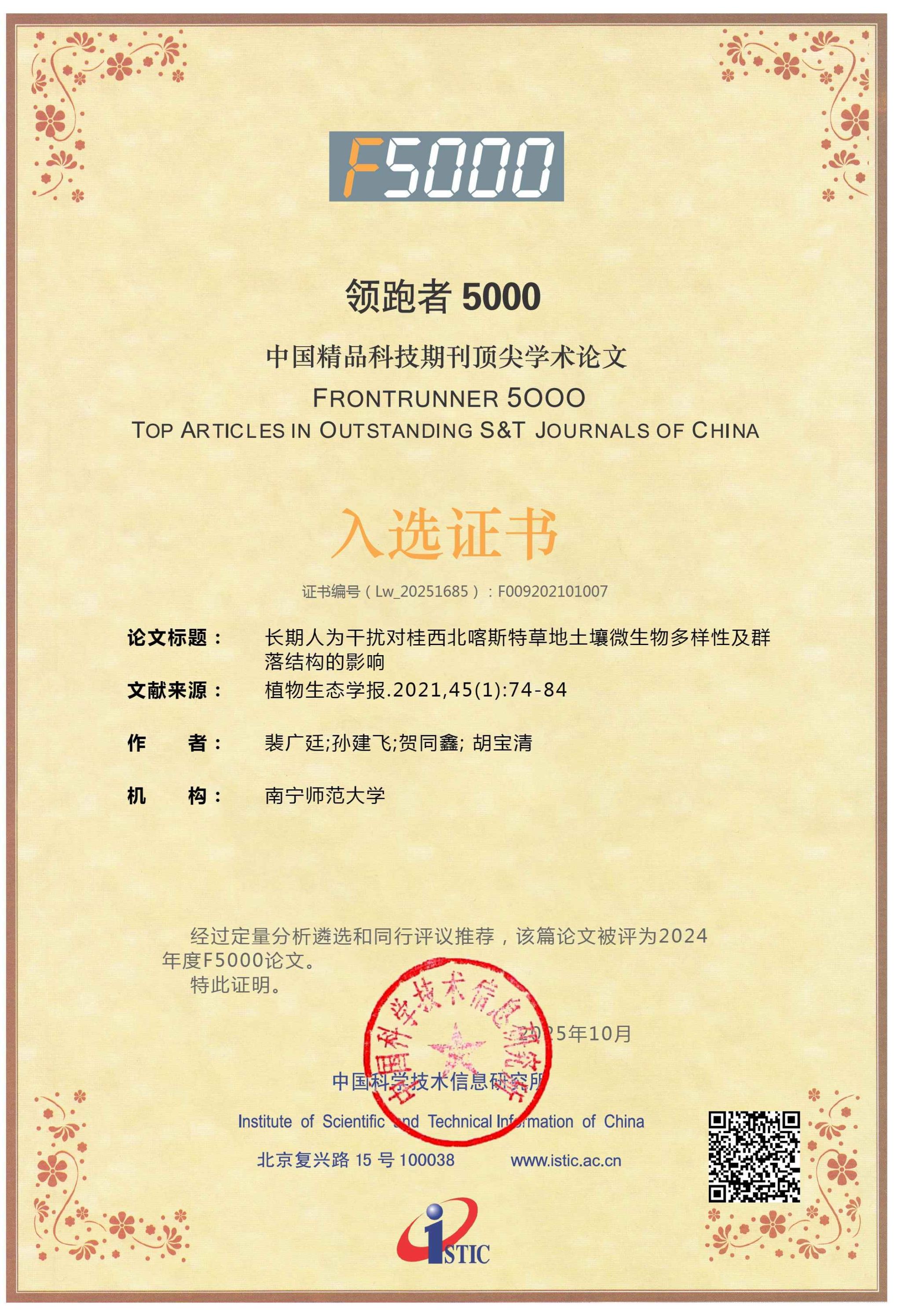近日,国家科学技术部中国科学技术信息研究所正式发布2024年度“领跑者5000——中国精品科技期刊顶尖学术论文”(F5000)入选名单。beats365地理与海洋研究院土壤生态过程与石漠化修复团队于2021年发表在《植物生态学报》的论文《长期人为干扰对桂西北喀斯特草地土壤微生物多样性及群落结构的影响》成功入选。该论文同时荣获《植物生态学报》2024年度“优秀论文”,并入选学术精要“高PCSI指数、高被引、高下载”论文榜单,充分彰显了其学术影响力和持续关注度。
