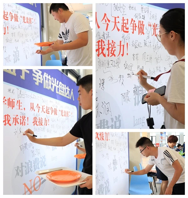 粥一饭,当思来之不易。学校加强对师生员工的节粮、节菜教育,加大“光盘行动”宣传力度,推行光盘换餐券、换积分等激励措施。食堂设置节约粮食、文明就餐的提醒标识,强化广大师生的节粮意识。通过“杜绝舌尖上的浪费”,引领师生养成节约用餐的良好习惯。后勤饮服中心借助展板、海报、文明桌贴、横幅、食堂LED显示屏、江科大微后勤等,多渠道、全方位弘扬勤俭节约,制作光盘行动签名墙。材料、电信学院团员青年在食堂餐具回收处摆放了抽奖小便签和各种口味薄荷糖,作为践行光盘行动的奖励。遇到浪费食物的同学就对其进行劝导,鼓励他们在购买饭菜时适当增减,争取做到“心知肚明”“量力而行”。材料学院严豪敏同学说:“这次光盘活动给同学们敲响了警钟,在这个不愁吃不愁喝的年代,我们更要居安思危,勤俭节约。我们一定要从自身做起,为节约奉献自己的力量。”船海、生技学院开展了“节粮爱粮”光盘打卡活动。船海学院将活动分为线上挑战赛和线下分享周:线上挑战赛,师生对自己的光盘进行QQ空间、朋友圈分享打卡,集赞兑换纪念;线下在学校食堂对每一餐实现光盘的师生给予水果、零食等鼓励。