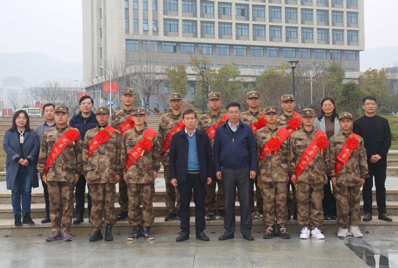 随后,校党委书记葛世伦专程和入伍新兵合影留念并亲切话别,叮嘱同学们到了部队继续学习,肩负起保家卫国的重任,早日实现从一名优秀大学生向一名合格军人的转变。12位同学在锣鼓声中踏上了当兵的征程。
