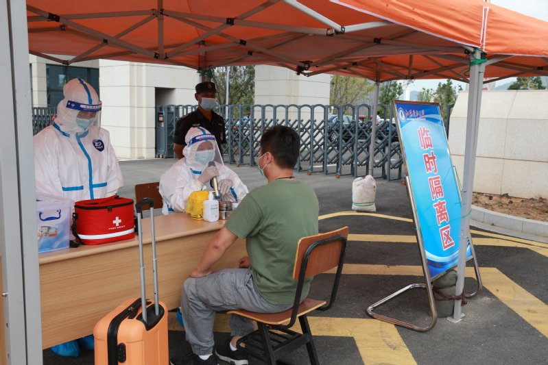 本次应急处置演练分为南大门报到现场和集中隔离医学观察区两个场景,模拟了健康学生返校报到和检测出返校学生中有发热病例的应急处置全过程。演练内容涵盖入校检查、现场消杀、现场应急隔离、流行病学调查、转往集中隔离医学观察区等环节。