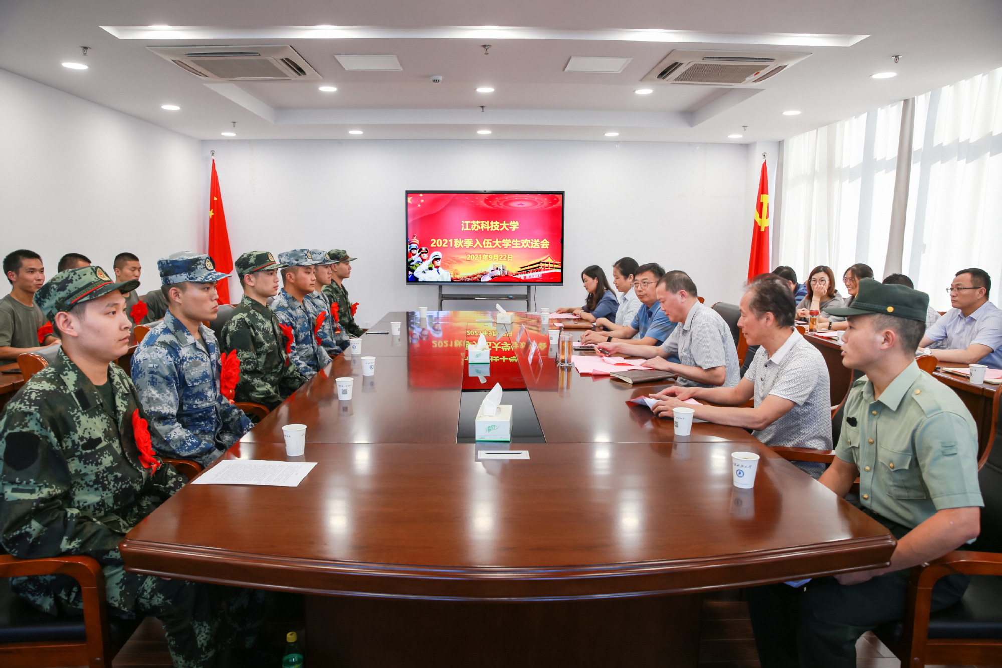 9月22日下午,万象城awcsport官网2021年秋季入伍大学生欢送会在长山校区行政楼举行,欢送即将奔赴军营的24名大学生新兵。副校长汤建、人武部部长蒋宏志、入伍大学生所在学院党委副书记、全体入伍大学生、退伍大学生代表等参加欢送会。