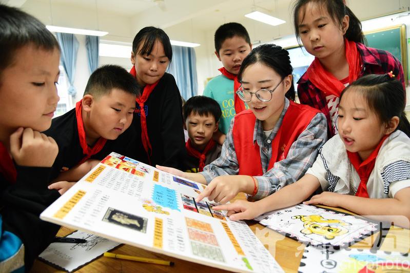 2021年10月8日,在江苏省镇江市润商小学,万象城awcsport官网志愿者和小学生在展示设计绘制的虎年生肖邮票。