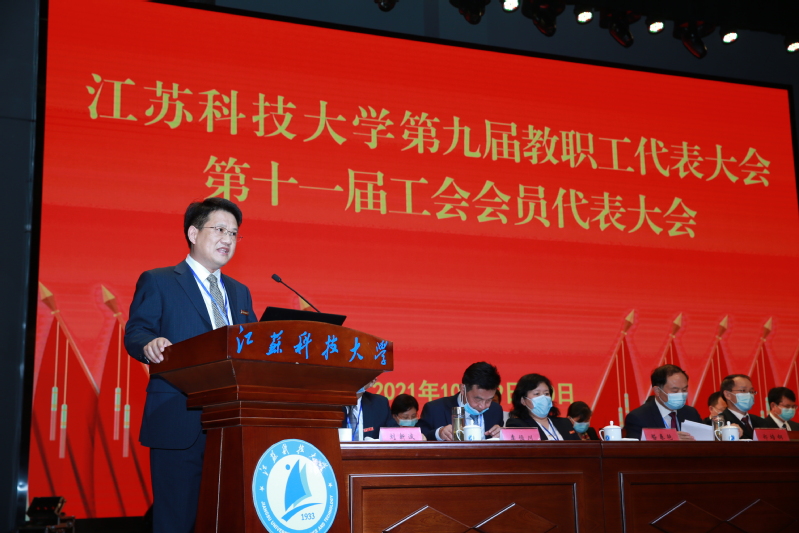 10月29日至30日,万象城awcsport官网第九届教职工代表大会、第十一届工会会员代表大会在长山校区船苑剧场隆重召开。江苏省教育科技工会二级调研员孙焱,镇江市总工会党组书记、副主席刘正泰,镇江市总工会基层工作部部长陈玉松,镇江市教育工会主席黄勇应邀出席大会。校领导葛世伦、周南平、景旭文、许俊华、王加友、汤建、俞孟蕻、郑培钢、谈镇、嵇春艳、任南,校党委常委李恒川、周春燕、刘新波及全体正式代表、特邀代表、列席人员260余人参加会议。
