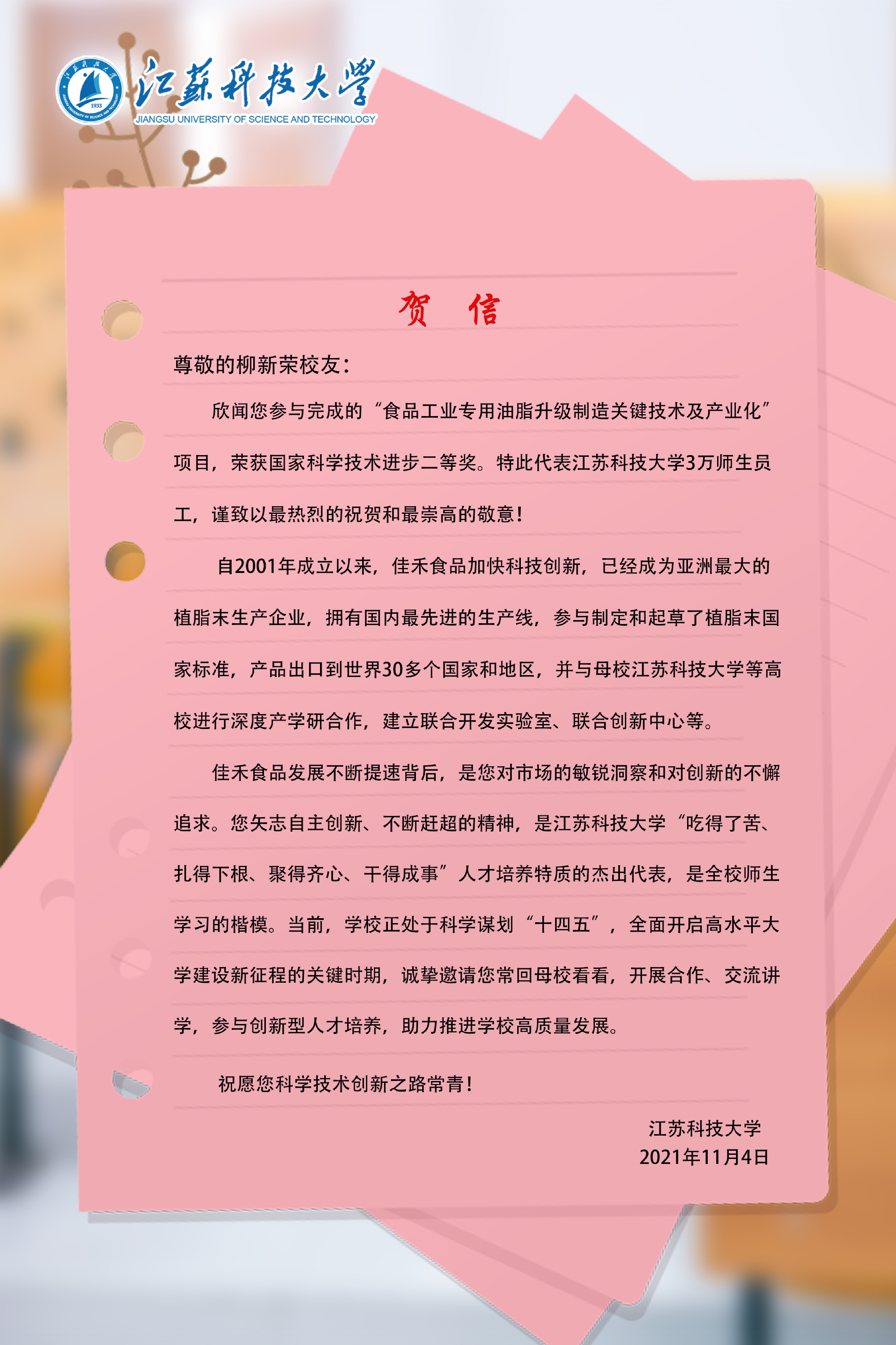 此次柳新荣校友参与完成的获奖项目,在国内率先开展非氢化油脂相关基础理论,加工技术和核心装备设计制造的研发工作,完善了非氢化专用油脂的理论基础体系,攻克了核心加工技术难题,实现了系列非氢化专用油脂产品的创新制造,制定了系列相关国家行业标准,全面推动了我国相关加工食品的升级换代。