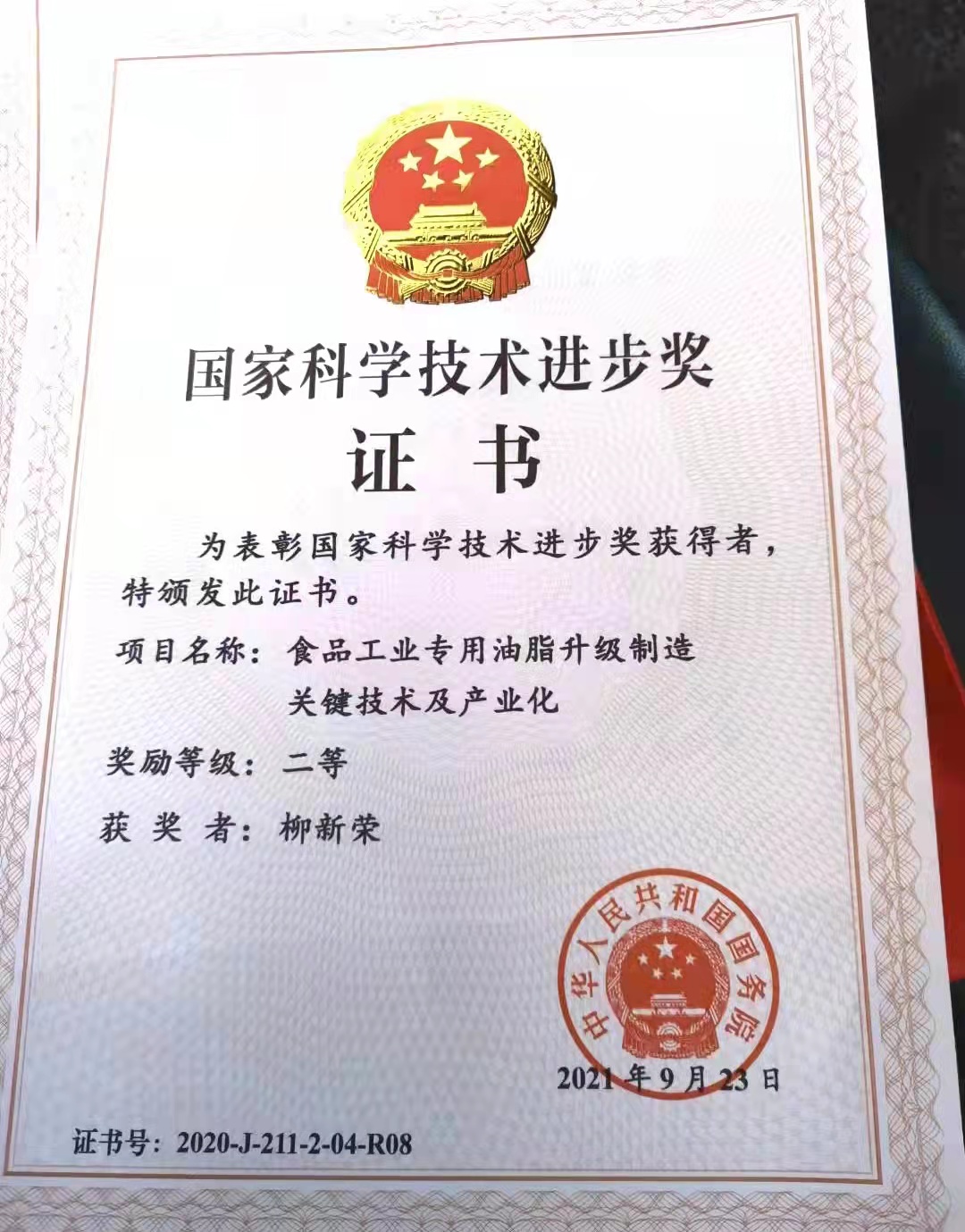 2021年11月3日上午,2020年度国家科学技术奖励大会在北京人民大会堂隆重举行。万象城官网1991届杰出校友、苏州佳禾食品股份有限公司董事长柳新荣获得国家科技奖二等奖(排名第八),获奖项目是《食品工业专用油脂升级制造关键技术及产业化》。