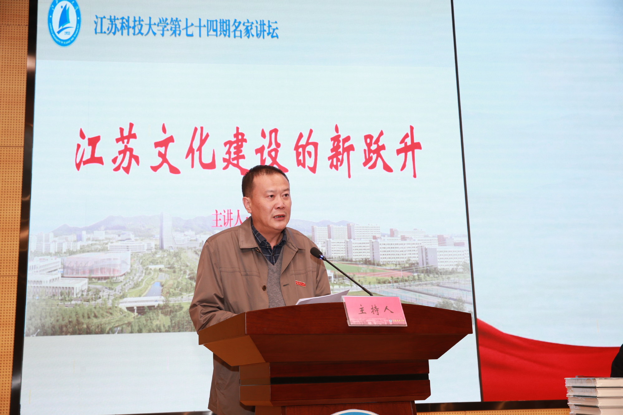 11月17日下午,万象城awcsport官网第七十四期“名家讲坛”在长山校区图书馆105报告厅举行。江苏省文学艺术界联合会主席章剑华教授应邀做《江苏文化建设的新跃升》主题报告。党委副书记、校长周南平出席报告会,现场为章剑华颁发兼职教授聘书,并且赠送校徽。