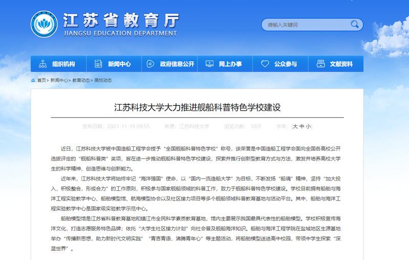船舶模型馆是江苏省科普教育基地和镇江市全民科学素质教育基地,馆内主要展示我国最具代表性的船舶模型。学校积极宣传海洋文化,打造志愿服务特色品牌;依托“大学生社区接力计划”向社会普及舰船海洋知识。船舶与海洋工程学院在盐城地区生源基地举办“传播新思想,助力新时代文明实践”“青言青语,沸腾青年心”等主题活动,将船舶模型送进高中校园,带领中学生探索“深蓝世界”。