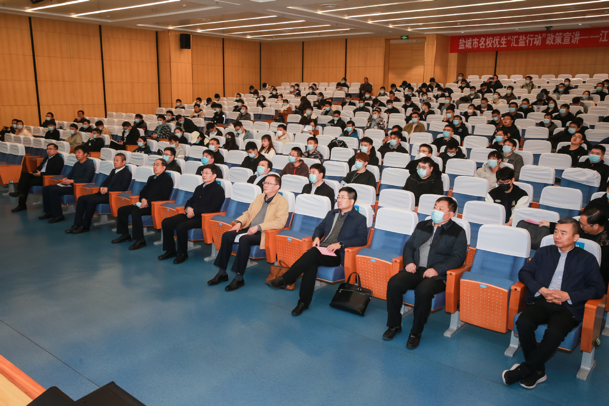 周达虎向同学们介绍盐城市及盐都区的引才政策,表达盐城市对人才的渴求以及对江科大学子的欢迎。学校毕业生代表介绍了在盐城的工作、生活和学习情况,表示要建设美好盐城,期望有更多江科大优秀学子加入盐城的经济建设。