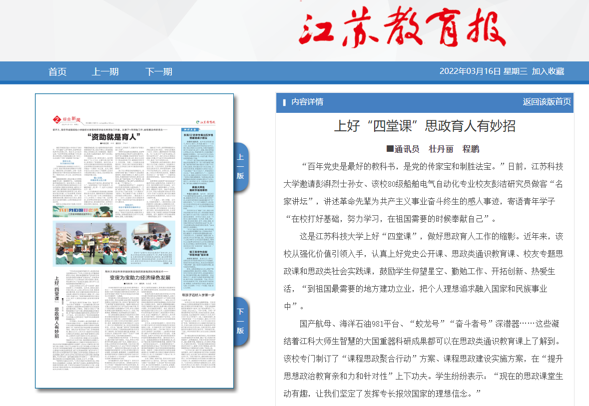 国产航母、海洋石油981平台、“蛟龙号”“奋斗者号”深潜器……这些凝结着江科大师生智慧的大国重器科研成果都可以在思政类通识教育课上了解到。该校专门制订了“课程思政聚合行动”方案、课程思政建设实施方案,在“提升思想政治教育亲和力和针对性”上下工夫。学生纷纷表示:“现在的思政课堂生动有趣,让我们坚定了发挥专长报效国家的理想信念。”