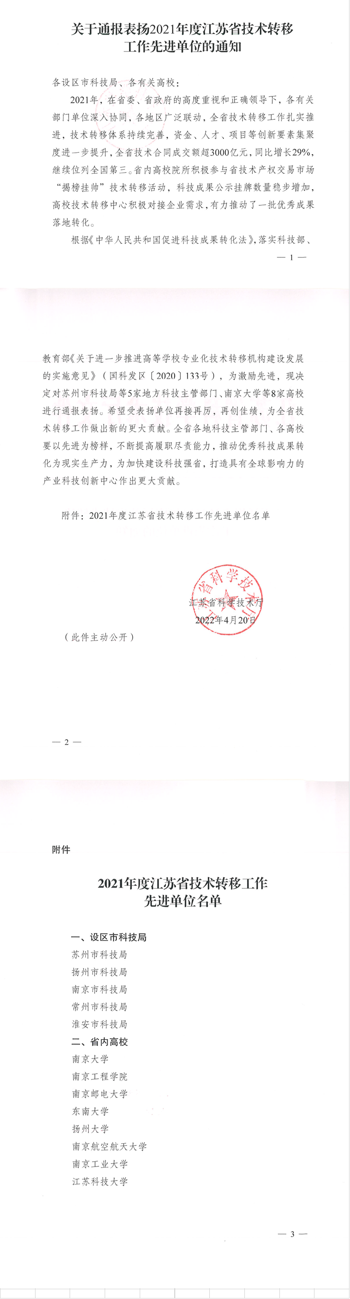 4月21日上午,江苏省科技厅在南京召开2021年度技术转移工作会议,会议全面总结2021年度全省技术转移工作,表彰先进。万象城官网首次荣获2021年度江苏省技术转移工作先进单位。此外,还获得J_TOP创新战优秀项目二等奖、江苏省技术转移工作先进个人荣誉。