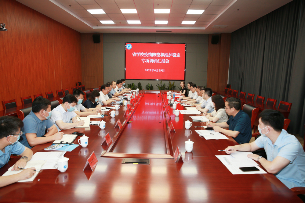 6月29日上午,省学校疫情防控和维护稳定专项调研组来校开展调研。调研组组长、省教育厅二级巡视员曹国平,校长周南平,党委常委、副校长汤建,党委常委、党委宣传部部长周春燕,党委常委、党委统战部部长、党委办公室主任刘新波出席调研会。会议由汤建主持。