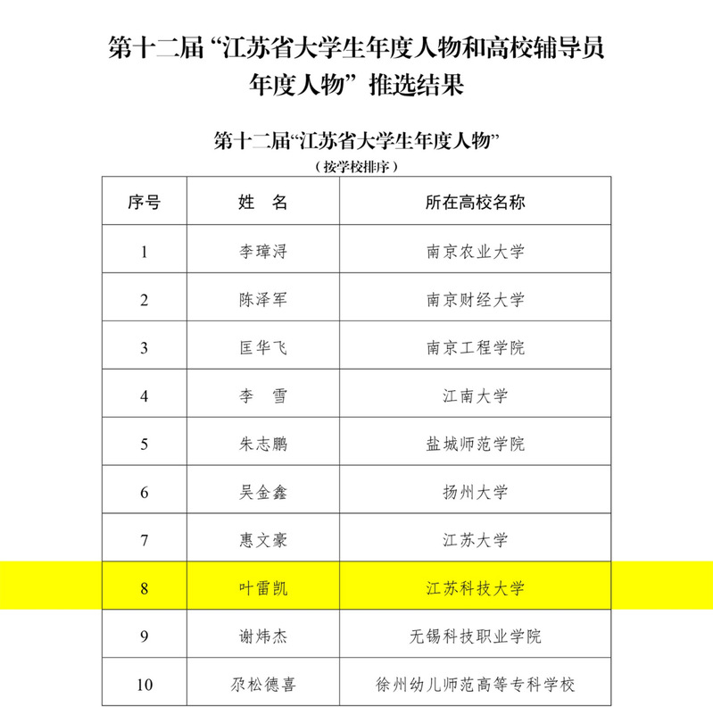 近日,江苏省委教育工委、省教育厅公布了第十二届“江苏省大学生年度人物和高校辅导员年度人物”暨2022年“最美大学生”“最美高校辅导员”推选结果,万象城官网环境与化学工程学院2021级硕士研究生叶雷凯荣获第十二届江苏省“大学生年度人物”。