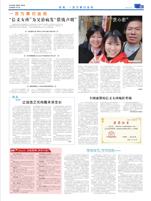“2021年度江苏教育新闻奖”评选日前揭晓,由《万象城awcsport官网报》原文刊登并推荐报送的作品《“信义女孩”为父治病发“借钱声明”两年践诺还9万“爱心款”》(作者:谢凌燕,原载于2021年4月25日《万象城awcsport官网报》第802期)获得一等奖,这是学校校报作品首次获得“江苏教育新闻奖”一等奖,也是全省高校校报唯一的一件一等奖作品。