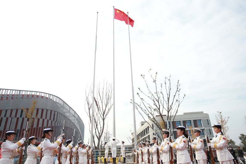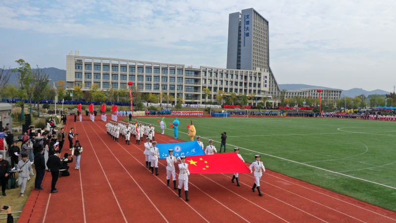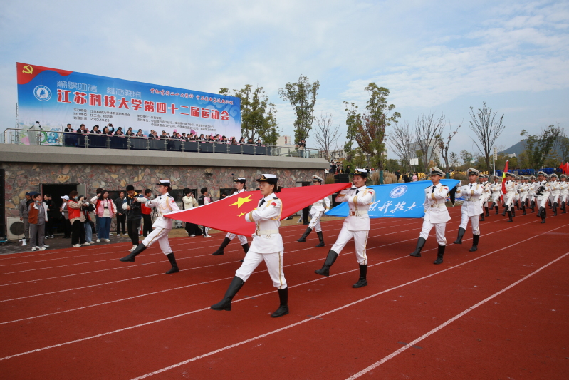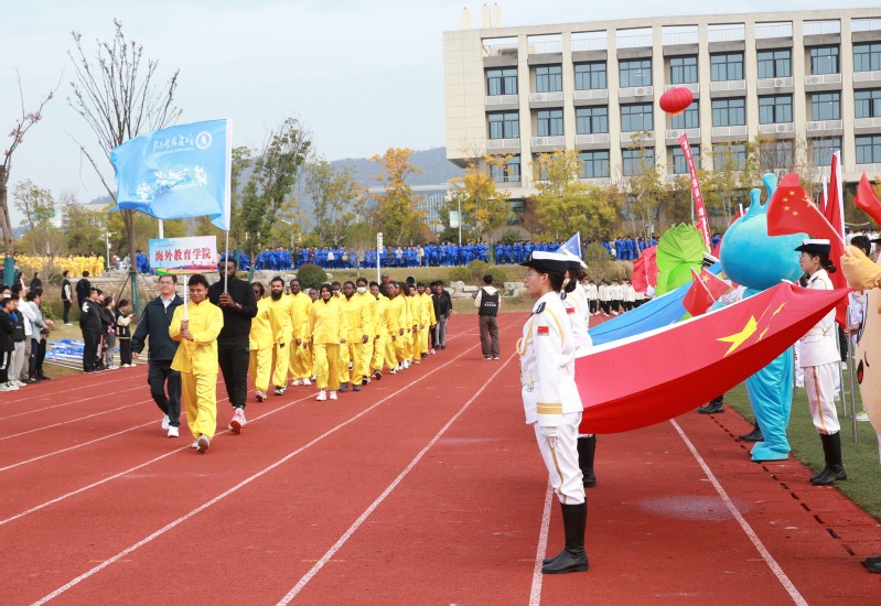 迎着朝阳,国旗护卫队成员护卫着国旗,踏着整齐的步伐,昂首阔步走向主席台。在国旗方阵和校旗方阵的带领下,裁判员方阵、教职工方阵和20个学院的运动员代表迈着铿锵有力的步伐依次入场,展现了学校师生昂扬向上、拼搏奋进的精神风貌。全体师生列队肃立,注视着五星红旗冉冉升起,齐声唱响《中华人民共和国国歌》。
