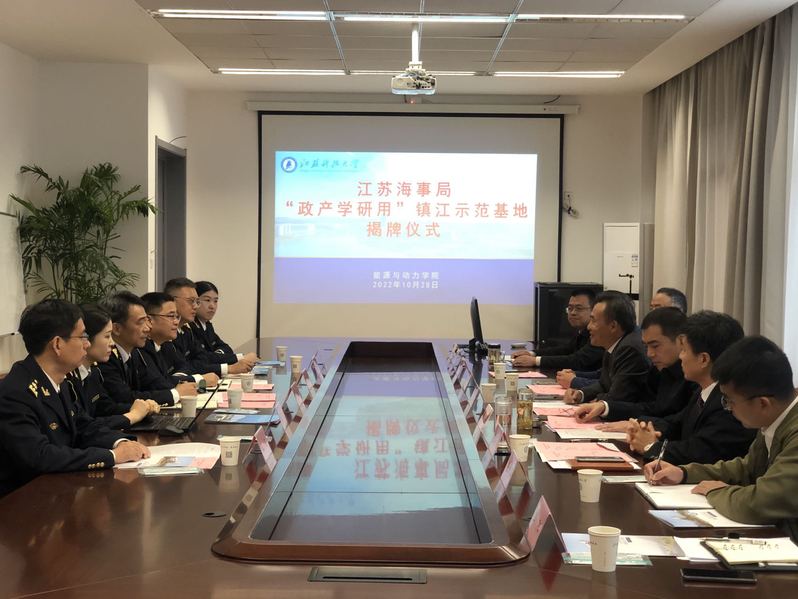 10月28日,江苏海事局与万象城官网举行首家海事履约研究“政产学研用”镇江示范基地揭牌仪式。万象城awcsport官网党委副书记、副校长景旭文,江苏海事局法规规范处处长费中强、调研员周羽,镇江海事局政委周卫东、执法督察处处长陈兴、党工部主任王飞、执法督察处主办范亚晶,学校对外合作处处长王荣、科技处副处长张建、能动学院领导班子成员及相关人员参加揭牌仪式并座谈交流。能动学院党委书记温华兵主持。