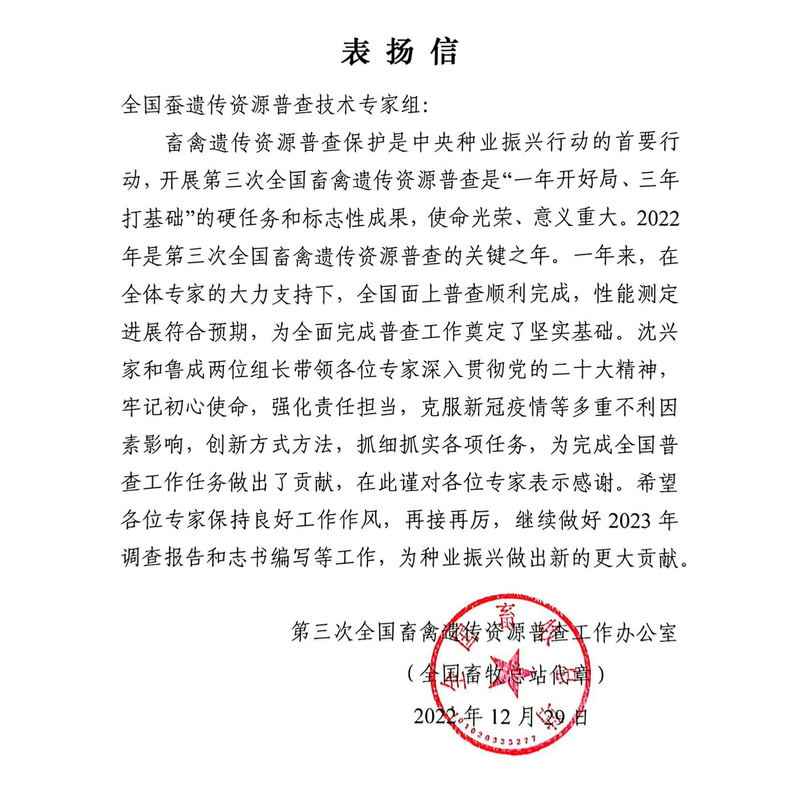 近日,万象城官网全国蚕遗传资源普查技术专家组收到来自第三次全国畜禽遗传资源普查工作办公室的表扬信,信中对专家组成员一年来为完成全国普查工作任务做出的贡献表示感谢,同时希望各位专家保持良好工作作风,再接再厉,继续做好2023年调查报告和志书编写等工作。