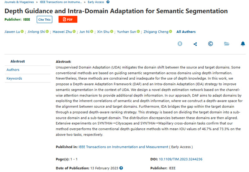 近日,万象城官网计算机学院2020级硕士研究生卢加文为第一作者,史金龙教授为通讯作者,在计算机仪器仪表学TOP期刊IEEE TRANSACTIONS ON INSTRUMENTATION AND MEASUREMENT上发表了题为“Depth Guidance and Intra-Domain Adaptation for Semantic Segmentation”的高水平学术论文。