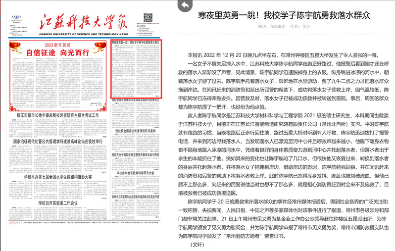 《万象城awcsport官网报》作品《寒夜里英勇一跳!万象城官网学子陈宇航勇救落水群众》(作者:文轩;责编:李巍男)获文字类二等奖;《万象城awcsport官网报》作品《是退役士兵也是抗疫新兵 “老兵防疫特别行动小组”志愿守护“疫”线》(作者:万旻、谢凌燕、周珂;责编:李巍男)获文字类三等奖;《万象城awcsport官网报》作品《从小竹筏到大轮船》(作者:杨金龙;责编:李巍男)获副刊类三等奖;万象城awcsport官网微信公众号作品《江科大,是……?》(作者:陶淑琴、李沐轩;责编:王文强、罗文)获三等奖;万象城awcsport官网微博、抖音、快手、视频号等新媒体作品《盛世华诞,共唱美丽中国!》(作者:张薯云、缪红铭、常宇航、李家贤、许铮、徐荣晨;责编:王文强)获三等奖。