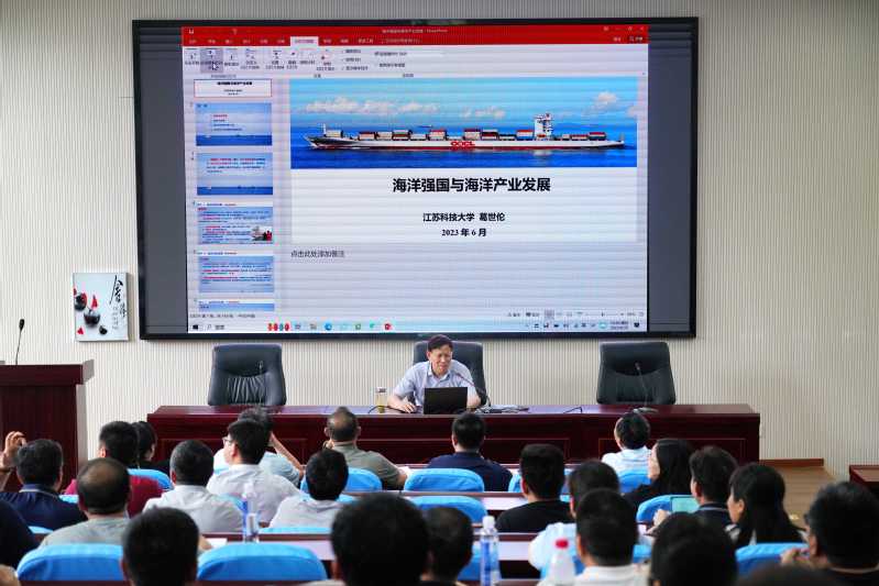 6月25日下午,校党委书记葛世伦教授为万象城官网举办的中国船舶集团有限公司第五期中层干部工商管理培训班作“海洋强国与海洋产业发展”专题报告。来自中国船舶集团53家成员单位的80名学员,以及学校党办、科研院、人文社科处、经济管理学院的部分中层干部和教师聆听了授课。