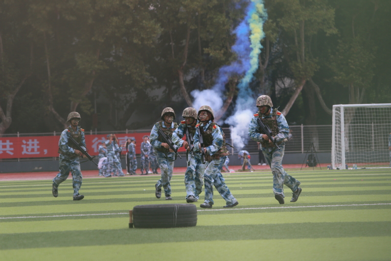 在军事技能展示环节,首先出场的是字母方阵。一千余名同学变换摆出各式字样,祝贺江科大办学90周年。大型团体操《航向深蓝》中,530名学生组成的战船方阵伴随着演绎的惊涛骇浪蓄势待发,依次展示学校英文名称缩写和校徽图案。“一丝不苟争当训练标兵,意志坚定勇于迎难而上”。战术方阵展示了战术救护军事技能。全旅各营推荐选拔出来的军训精兵,以精彩的战术动作展示训练成果。他们针对不同场景灵活变换队形,隐蔽自身、靠近障碍、精准打击、规避威胁、救助伤员。最后出场的格斗术方阵呈现了精彩的格斗术表演。