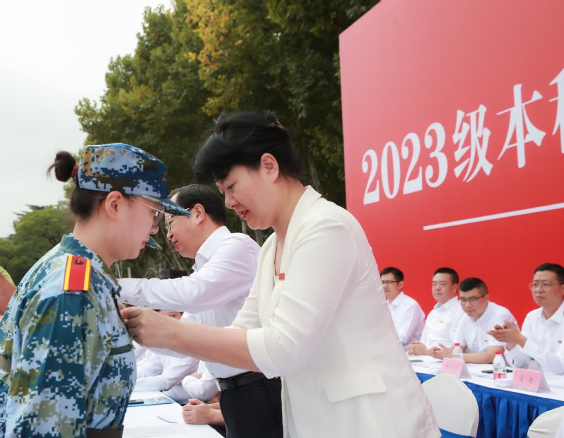 开学典礼在振奋人心的校歌声中落下帷幕。随后举行2023级新生军训成果汇报会。校长嵇春艳依次检阅各营军训方阵。