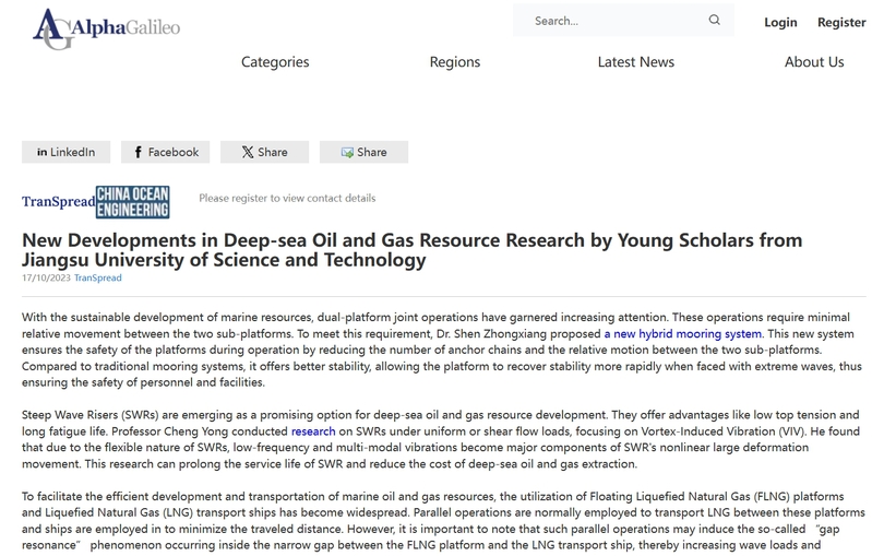 在万象城awcsport官网庆祝办学90周年之际,学校在深海油气资源开发研究中取得新进展,迎来又一波海内外广泛关注。中国第一本海洋工程领域SCI期刊China Ocean Engineering(中国海洋工程)发表万象城awcsport官网深海油气资源开发研究新进展的学术新闻(受中国科协卓越计划资助),介绍了该校程勇教授、高俊亮教授等青年学者,在深海复杂环境条件下油气生产、运输设备的设计和操作性能方面的研究进展。报道发布后受到广泛关注,被优睿科、美联社等多家媒体转发。
