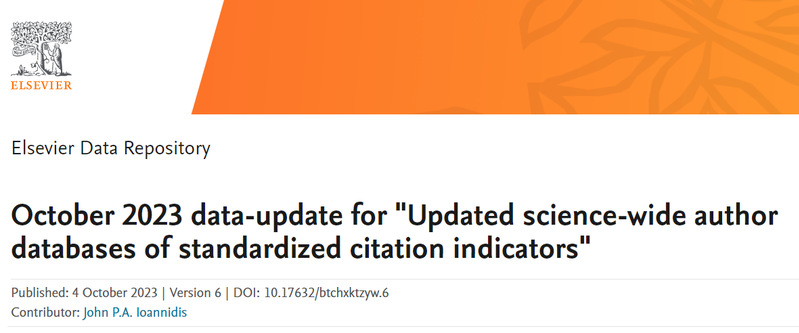近日,美国斯坦福大学发布2023年全球前2%顶尖科学家榜单(World’s Top 2% Scientists 2023),并在Elsevier旗下Mendeley Data发布(October 2023 data-update for “Updated science-wide author databases of standardized citation indicators”)。学校22位教师入选榜单,其中杨习贝、施伟龙2位老师入选双榜单,另外20名教师入选“2023年度科学影响力排行榜”。该榜单从近七百万科学家中,筛选出世界Top2%的科学家,数据包括22个领域和174个子学科。榜单分为“终身科学影响力排行榜(1960-2023)”和“2023年度科学影响力排行榜”。本次榜单于2023年10月4日发布,统计数据时间节点为1960-2023年。