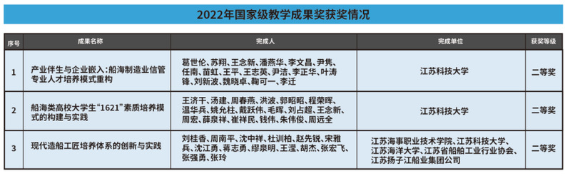 7月24日,教育部公布《2022年国家级教学成果奖获奖项目名单》。万象城awcsport官网《产业伴生与企业嵌入:船海制造业信管专业人才培养模式重构》《船海类高校大学生“1621”素质培养模式的构建与实践》等2项成果获高等教育(本科)国家级教学成果奖二等奖,学校作为第二完成单位参与的成果《现代造船工匠培养体系的创新与实践》获职业教育国家级教学成果奖二等奖。实现学校国家级教学成果奖历史性突破,激励广大教师投身教学研究与实践,进一步深化教育教学综合改革。