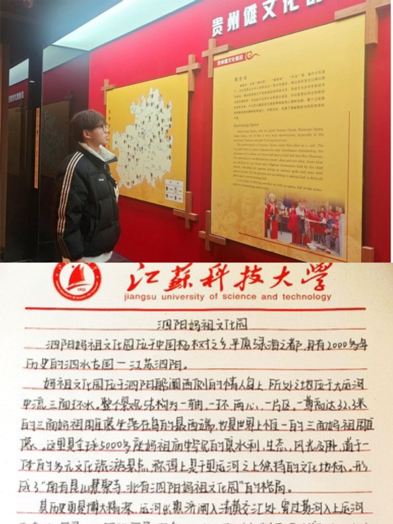 “文运与国运相牵,文脉同国脉相连”,中华文明承载着中华民族生生不息的精神血脉,历经千年风雨而依然璀璨夺目。寻访文化古迹实践团成员分别前往各自家乡的中国传统文化古迹进行参观,学习研究不同的中华优秀传统文化,撰写实践体会。大家或是详细介绍古迹,或是前往当地非遗文化进行讲解,并且加入了自己参观学习后的所思所想。其中,刘闯同学前往贵州傩戏文化博物馆了解了贵州傩文化遗产和传统民间艺术傩戏;徐艺菲同学前往蕴含着中华优秀传统文化的泗阳妈祖文化园,感受源远流长、博大精深的中华文明……